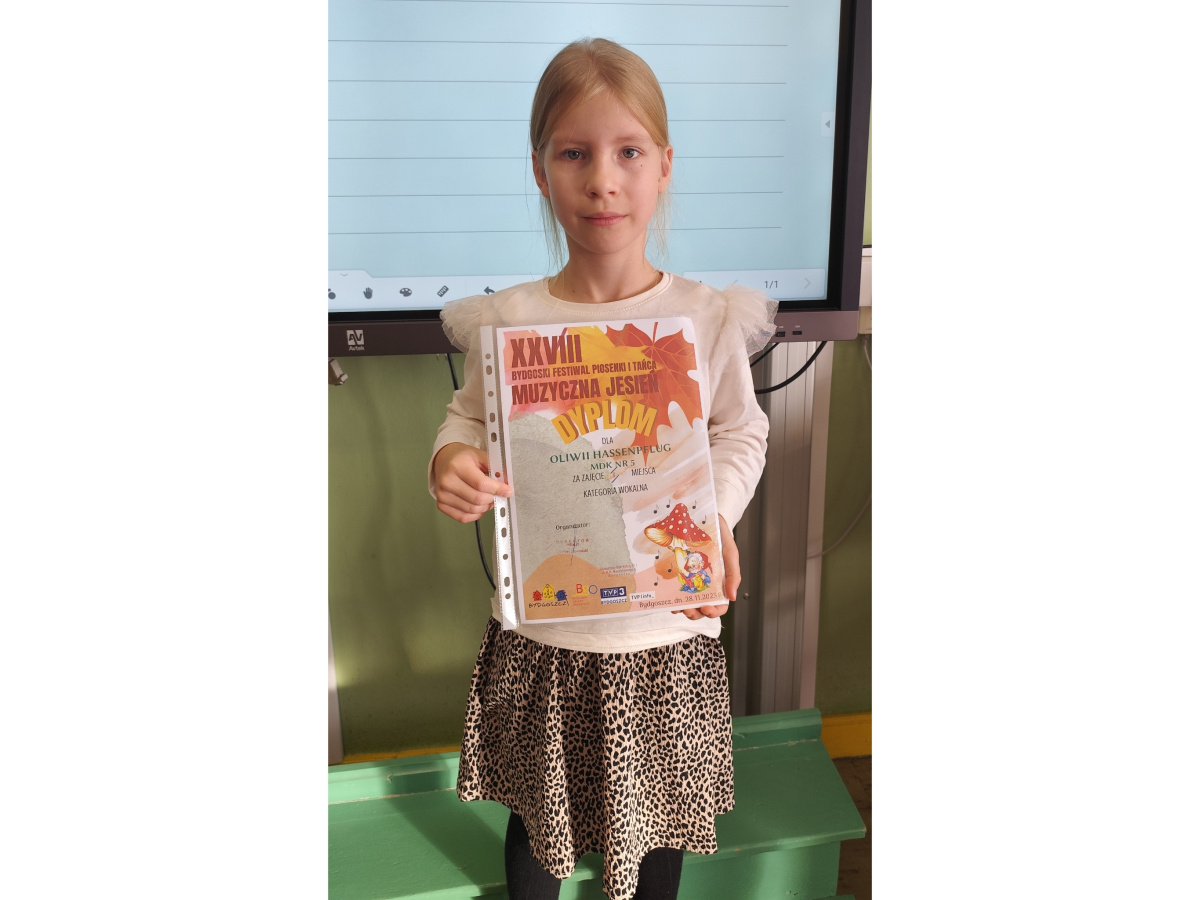 Uczennica Oliwia z klasy 2C zajęła I miejsce w kategorii wokalnej w XXVIII Bydgoskim Festiwalu Piosenki i Tańca „Muzyczna Jesień”. Gratulujemy wspaniałego występu oraz życzymy dalszych sukcesów artystycznych!