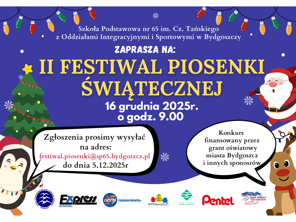 Serdecznie zapraszamy i czekamy na Wasze zgłoszenia. Poniżej znajdują się szczegółowe informacje i pliki do pobrania. Zgłoszenia prosimy wysyłać na adres: festiwal.piosenki@sp65.bydgoszcz.pl do dnia 5.12.2025r