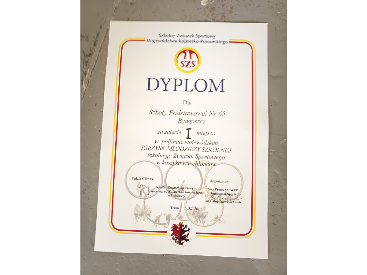 W dniu 17 marca uczniowie naszej szkoły wzięli udział w Półfinale Wojewódzkim Igrzysk Młodzieży Szkolnej w koszykówce chłopców. Gospodarzem i również uczestnikiem była SP nr 3 z Torunia. Pierwszy mecz rozegraliśmy z gospodarzem turnieju, po bardzo wyrównanym meczu wygraliśmy 50 :43. Kolejny mecz rozegraliśmy z SP Osielsko pokonując ich zdecydowanie 56:27. Wywalczyliśmy awans do finału wojewódzkiego, co ważne z zaliczonym zwycięstwem na drużyną SP nr 3 Toruń, która również uzyskała awans do finału. Trzymamy kciuki za naszych zawodników w finale, który odbędzie się 1 kwietnia w Inowrocławiu.