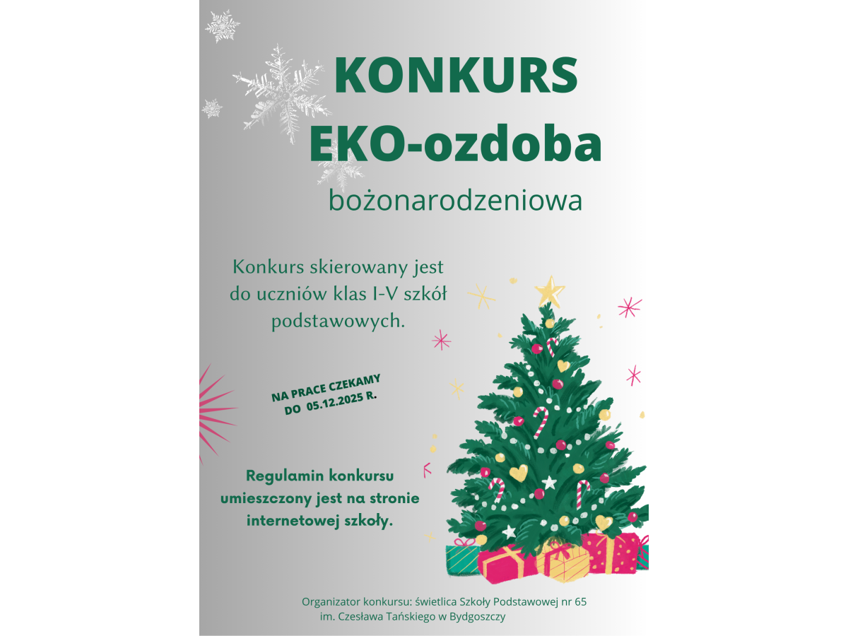 Zapraszamy uczniów klas I-V do udziału w kolejnej edycji konkursu "EKO-ozdoba bozonarodzeniowa". Celem konkursu jest zwiększenie świadomości ekologicznej. Zadanie polega na wykonaniu ozdoby świątecznej z wykorzystaniem surowców wtórnych lub naturalnych. Szczegółowe informacje znajdują się w regulaminie.