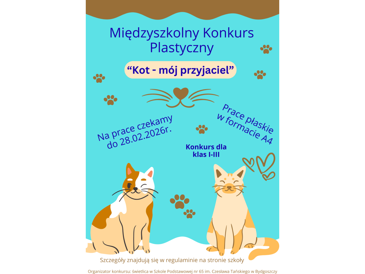 Zapraszamy wszystkich uczniów z klas 1–3 do wzięcia udziału w konkursie plastycznym, którego bohaterem jest… kot! To świetna okazja, aby puścić wodze fantazji i pokazać, jak według Was wygląda najbardziej wyjątkowy koci przyjaciel. Możecie malować, rysować, wyklejać — liczy się pomysł i dobra zabawa. Dołączcie do nas i pokażcie światu swoje kocie arcydzieła.