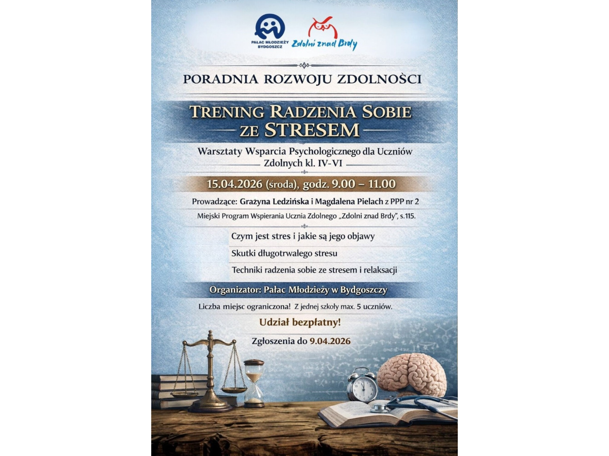 Spotkanie zatytułowane „Trening radzenia sobie ze stresem” odbędzie się 15 kwietnia 2026 r. (środa) w godz. 9:00–11:00 w sali 115 Pałacu Młodzieży. Podczas warsztatów uczestnicy zapoznają się z pojęciem stresu, rozwiną umiejętności rozpoznawania najbardziej typowych jego objawów oraz dowiedzą się o skutkach długotrwałego działania. W toku zajęć przedstawione zostaną techniki skutecznego panowania nad stresem. Uczestnicy będą mieli okazję przećwiczyć umiejętności odprężania i relaksacji, co pozwoli im lepiej radzić sobie ze stresem w trudnych momentach swojego życia.